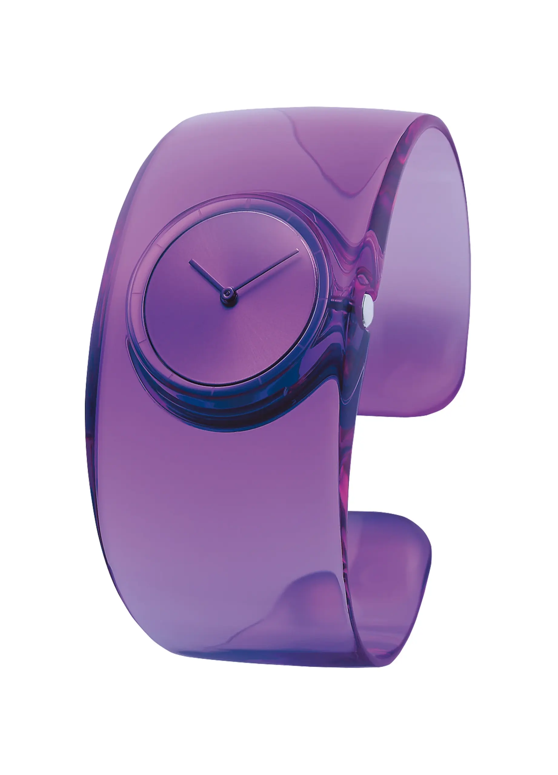 นาฬิกาที่มีรูปร่างเหมือนน้ำที่แสดงเวลาอย่างโปร่งใส (eau แปลว่าน้ำในภาษาฝรั่งเศส) ด้วยคอนเซ็ปต์ “นาฬิกาที่มีรูปร่างเหมือนน้ำที่แสดงเวลาได้อย่างโปร่งใส” ซีรีส์ “O” ใช้วัสดุโปร่งใส ซึ่งเป็นคุณสมบัติพิเศษของ Tokujin Yoshioka และส่องสว่างทันทีราวกับแสงแต่กลับไม่มีรูปร่างเหมือนน้ำ รุ่นสไตล์กำไลน้ำหนักเบานี้มีน้ำหนักเพียง 25 กรัม สามารถใช้เพื่อเสริมเครื่องแต่งกายของคุณได้ รุ่นนี้เป็นรุ่นลิมิเต็ดของ ISSEY MIYAKE SHOP